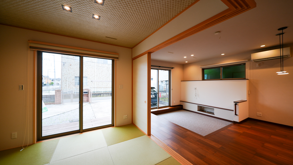 開放的なリビングと掘りごたつがある和室の組み合わせ